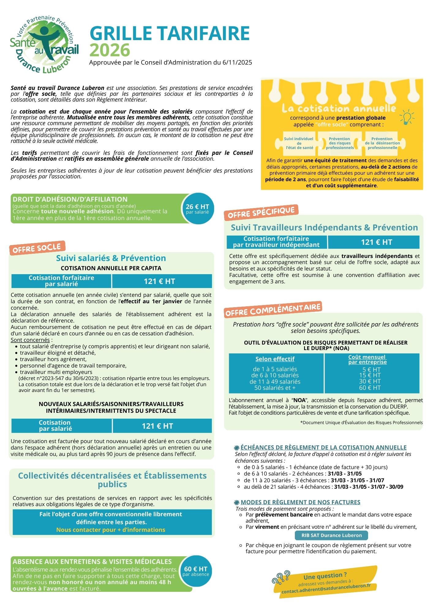 En tant qu'association à but non lucratif (loi de 1901), SAT Durance Luberon est financé par les cotisations de ses adhérents et mutualise des moyens pour préserver la santé des salariés dans le cadre de la règlementation en vigueur.